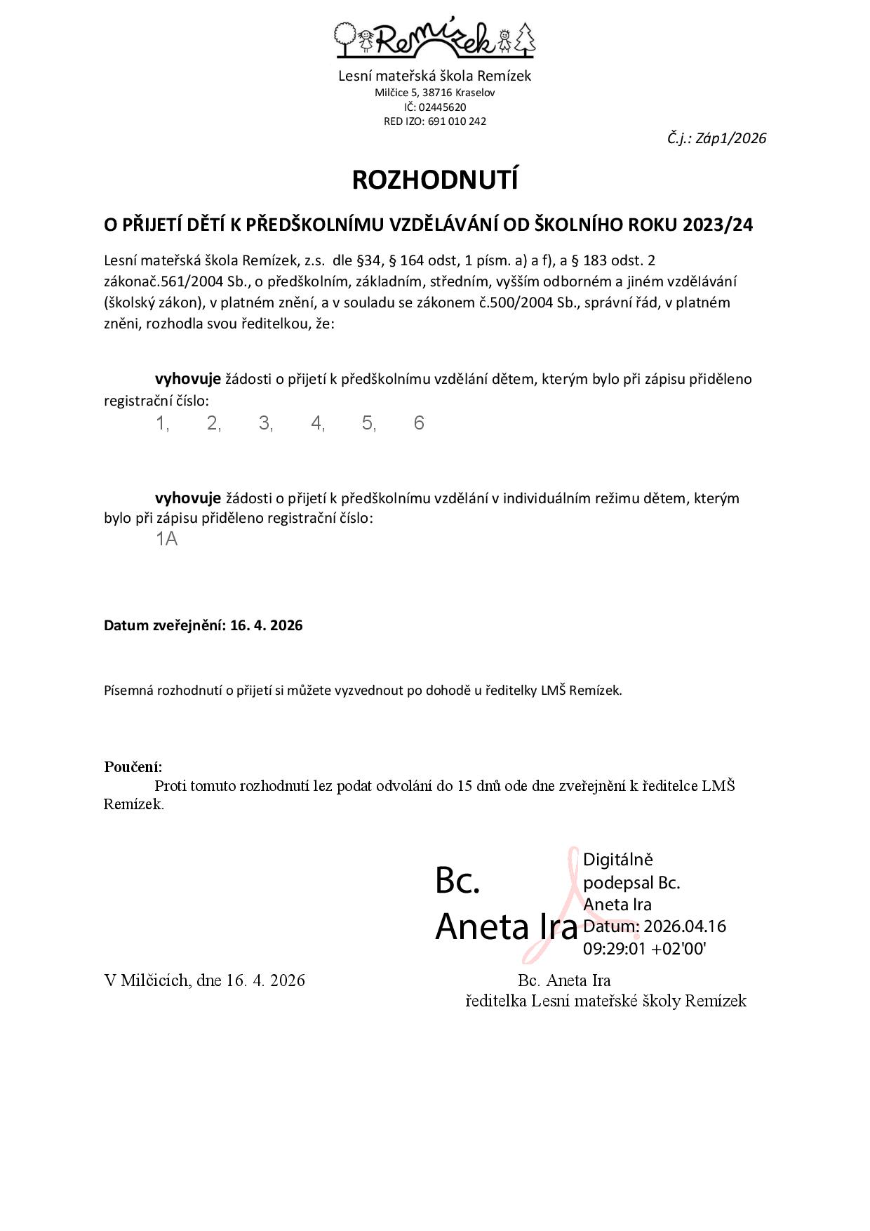 1, 2, 3, 4, 5, 6. - vyhovuje žádostem o přijetí k předškolnímu vzdělávání v individuálním režimu č.: